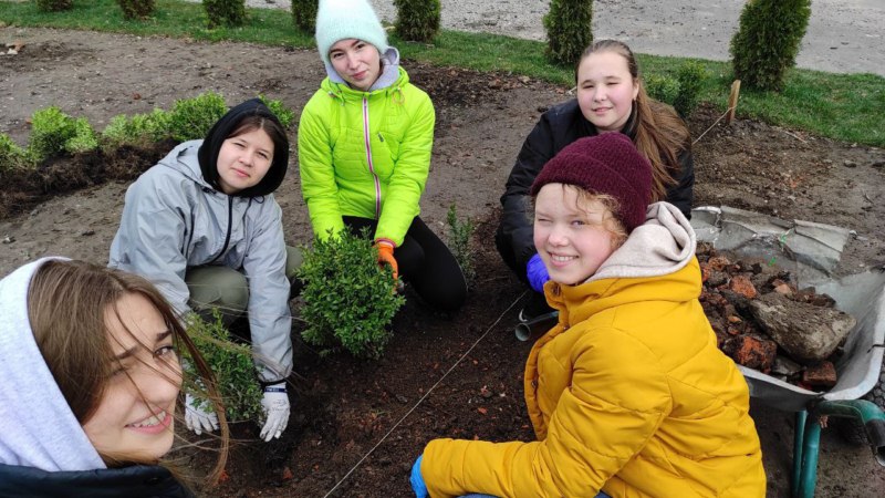 Гімназійні чоловіки продовжують приводити до ладу клумби в парку Сухомлинського