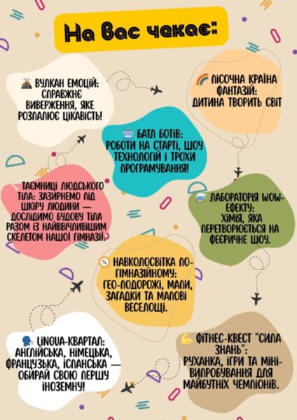 Шановні батьки та майбутні першокласники! Запрошуємо вас у дивовижну подорож світом знань і натхнення — на День відкритих дверей! На вас чекає не просто екскурсія, а захопливе науково-ігрове шоу, де кожен юний гість зможе відчути себе справжнім дослідником, мандрівником, митцем і винахідником.